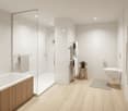 • Modern bathroom with white bathtub, white wash basins, white tiles, large mirror, modern art, toilet
