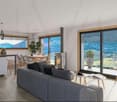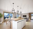 • Modern living area with white sectional sofa, wooden floors, panoramic windows, dining table and chairs, kitchen island, television and cabinet