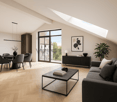 • The image shows a modern, open-plan living room and kitchen area. The living room features a gray sectional sofa, a coffee table, and a colorful abstract artwork on the wall. The kitchen has white cabinets, a wooden dining table with red chairs, and a sma