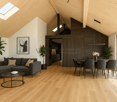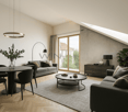 • Open layout with kitchen, large windows, tiled floor, wooden dining table with chairs, modern lamps, decorative cabinet