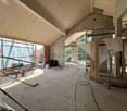 • Modern bathroom with washer and dryer, vanity sink, toilet, and glass shower enclosure. Large windows provide natural light. Wooden wall panels and neutral color scheme create a clean, minimalist aesthetic.