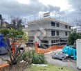 • Modern multi-story apartment building with large glass windows and balconies, surrounded by lush greenery and mountains in the background.
