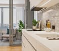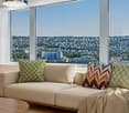 • Open space with glass doors leading to a balcony, sloped ceiling, kitchenette, and a view of the city.