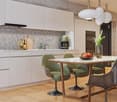 • The image shows a modern, open-concept kitchen and dining room. The kitchen features white cabinets, a dark countertop, and a built-in dishwasher. The dining area has a large wooden table with beige upholstered chairs, and several pendant lights hang abov