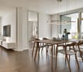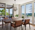 • Spacious open-plan living area with large windows offering a stunning view of the mountains and lake. The room features a dining table, comfortable seating, and a modern, minimalist design.
