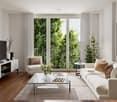 • Modern multi-story apartment building with balconies, large windows, and a landscaped outdoor area with seating and trees.