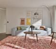 • Spacious living room with hardwood floors, white walls, large windows, green sofa, gray rug, orange bean bag chair, and a modern pendant light fixture