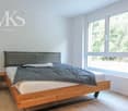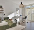 • Spacious bedroom with hardwood flooring, large windows providing natural light, and a balcony or terrace visible through the sliding glass doors.