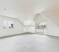 • empty attic room, gray floors, white walls, built-in cabinets, skylight windows
